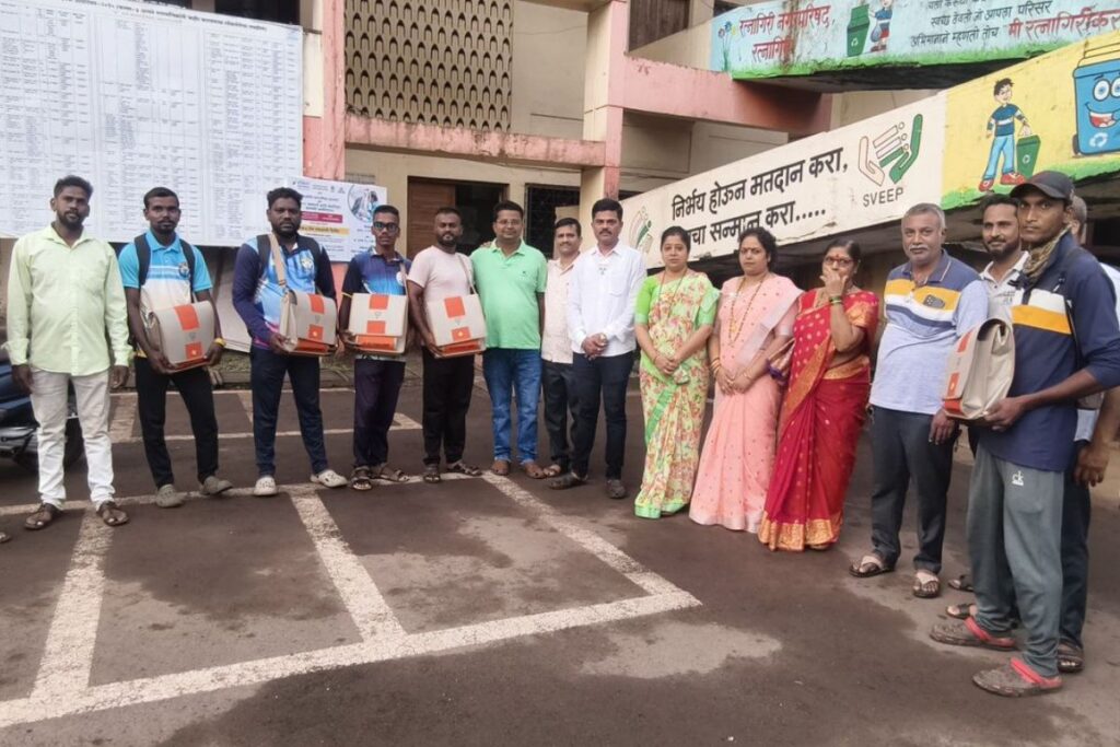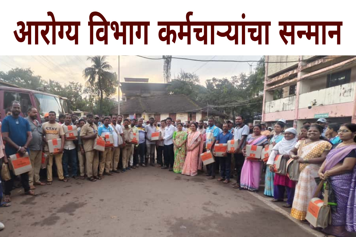 रत्नागिरी : भारतीय जनता पार्टी (भाजप) महिला मोर्चा जिल्हाध्यक्षा वर्षा परशुराम ढेकणे आणि शहराध्यक्ष दादा ढेकणे यांच्या पुढाकाराने रत्नागिरी नगरपरिषदेच्या आरोग्य विभागातील सर्व कर्मचाऱ्यांचा अनोख्या पद्धतीने सन्मान करण्यात आला.