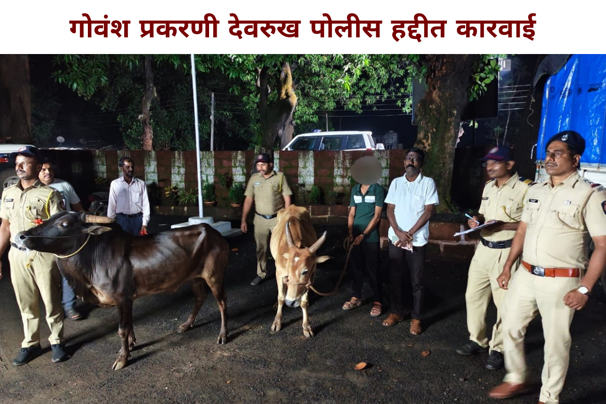 देवरुख : रत्नागिरी जिल्ह्यात गोवंश वाहतूक आणि कत्तल यासंबंधीच्या गुन्ह्यांना आळा घालण्यासाठी जिल्हा पोलीस अधीक्षक नितीन बगाटे आणि अपर पोलीस अधीक्षक जयश्री गायकवाड यांच्या मार्गदर्शनाखाली देवरुख पोलिसांनी मोठी कारवाई केली आहे. दि. 13 जून 2025 रोजी रात्री 20:35 वाजता साखरपा पोलीस दूरक्षेत्रातील मूर्ति चेकपोस्ट येथे नियमित गस्ती दरम्यान देवरुख पोलिसांनी संशयास्पद बोलेरो पिकअप वाहन (क्र. MH-08-M-4929) थांबवले.