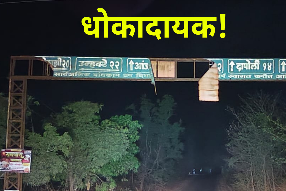 या धोकादायक पत्र्यामुळे अपघात होण्याची शक्यता आहे. विशेषत: दुचाकीस्वारांसाठी हा फलक जीवघेणा ठरू शकतो.