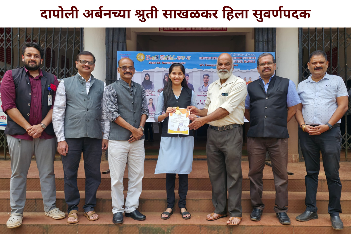 दापोली : मुंबई विद्यापीठाच्या विद्यार्थी भवन, चर्चगेट, मुंबई येथे 9 सप्टेंबर 2025 रोजी आयोजित वक्तृत्व-गट अ (मराठी) स्पर्धेच्या अंतिम फेरीत दापोली एज्युकेशन सोसायटीच्या दापोली अर्बन बँक सीनियर सायन्स कॉलेजमधील टी.वाय.बी.कॉम.च्या विद्यार्थिनी श्रुती चंद्रशेखर साखळकर हिने सुवर्णपदक पटकावलं.